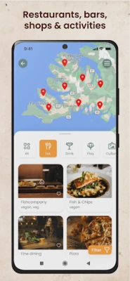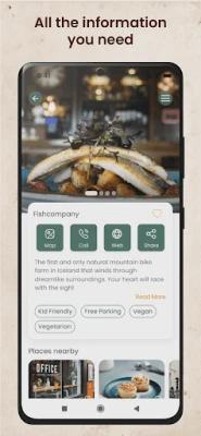 We also love the „Places nearby“ feature and the map that gives you an overview of the type of places you are looking for and how to get there.